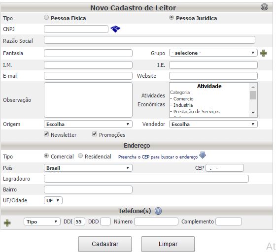 Para cadastrar um Leitor basta acessar o menu ‘Assinaturas> Cadastro> Leitor’ que irá abrir a tela de cadastro, igual a tela abaixo: