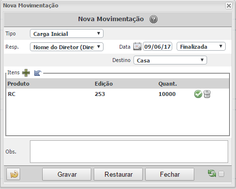 Na tela que irá abrir, basta clicar na opção do select de “Carga Inicial” e colocar o Estoque da Casa como destino. Veja: