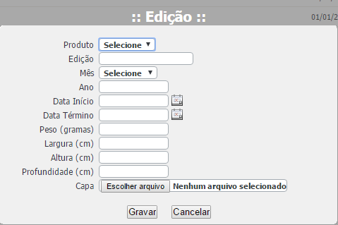 As informações obrigatórias dessa tela são Produto (só escolher no select), Edição (número da edição), Mês (mês de início da edição), Ano (ano daquela edição), Data Início e Data Término. As outras informações são opcionais.