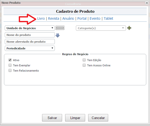 Nessa tela, basta você selecionar o Tipo do produto (se é um Livro, Revista, Portal) que as Regras de Negócios serão preenchidas conforme aquele tipo. Selecione a Unidade de Negócio e a Periodicidade e clique no botão para SALVAR.